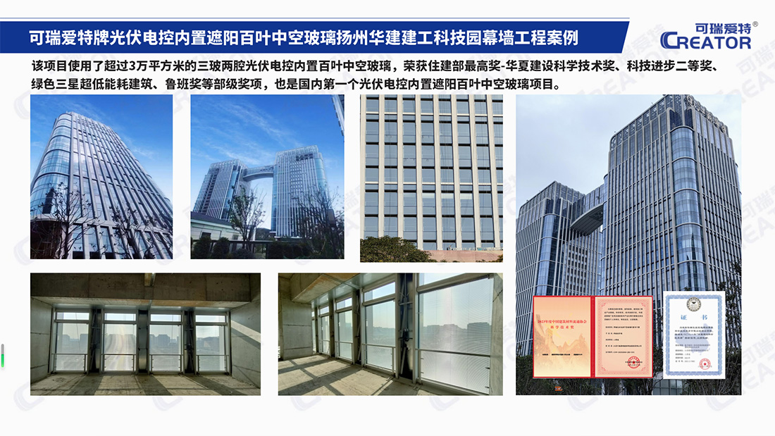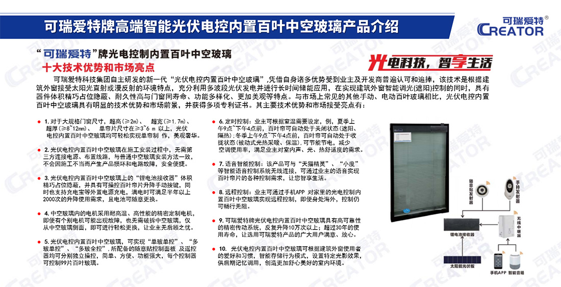 五、該產(chǎn)品可滿足制作6~10平方米/片的超大規(guī)格內(nèi)置百葉中空玻璃。控制方式可實(shí)現(xiàn)“單玻單控”、“多玻單控”、“多玻全控"等多種控制需求,同時(shí)具備使用更加貼心,操作簡(jiǎn)便,防火抗風(fēng),清潔美觀,又不影響建筑外立面的設(shè)計(jì)風(fēng)格等等諸多優(yōu)勢(shì),是現(xiàn)今國(guó)家大力倡導(dǎo)“節(jié)能門窗和玻璃幕墻需采用遮陽(yáng)措施”的首要選擇。